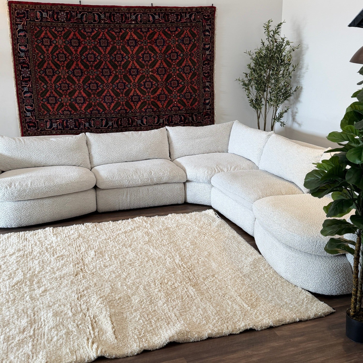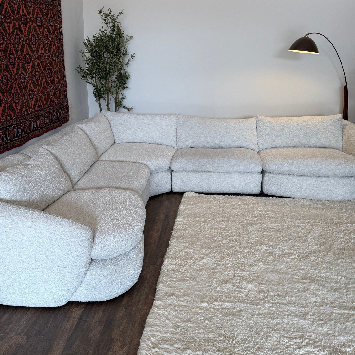 A modern modular sectional with a soft boucle-textured fabric and a spacious, inviting layout. This piece features reversible seat and back cushions, feather-blended foam seat cores, and flexible modular design that gives it a stylish yet comfortable everyday feel. Its curved shape makes a strong statement while still being cozy and functional for lounging or gathering.